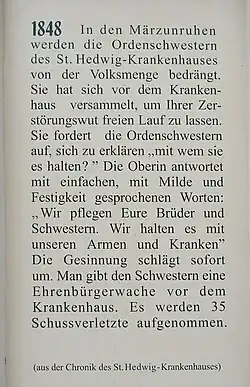 In den revolutionären Auseinandersetzungen des Jahres 1848 gab es einen Affront zwischen den Schwestern und den Aufständischen. Der Oberin gelang es, die aufgebrachten Arbeiter von ihrer Hilfsmission zu überzeugen, schließlich wurden sogar Verwundete aufgenommen und gepflegt.[5][6]