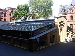 Ein gläserner Fußgängerübergang verbindet dieses Gebäude mit dem Südflügel des Haupthauses. Das Flachdach des Neubaus ist mit Moosen und Flechten begrünt.