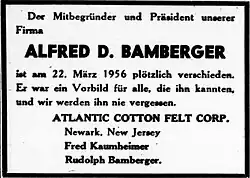 In Philadelphia gründete Alfred D. Bamberger 1944 zusammen mit dem aus Köln stammenden John H. Nathan eine Textilfabrik, die N. & B. Cotton Felt Corporation.[55] Die junge Firma wechselte 1946 nach Newark in den US-Bundesstaat New Jersey und firmierte dort zur Atlantic Cotton Felt Corporation um.[56][1] Das Unternehmen stellte beispielsweise Matratzen und Polster für Sitzmöbel her und bestand mindestens bis in die späten 1980er Jahre.[2][57] 1947 heiratete John H. Nathan Alfred D. Bambergers Tochter Gertrude.[58]