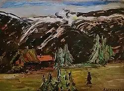 - Gebirgsdorf, Mischtechnik, 23 × 13,8 cm, Privatbesitz (WVZ HZ 144)