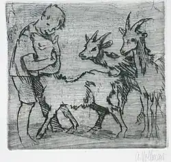 - Tiere mit Hirten auf der Weide in wortloser Harmonie, Einklang von Natur, Tier und Mensch. Alles jedoch auf das Wesentliche vereinfacht und trotz Naturtreue nicht fotorealistisch. Hunderte dieser Blätter enthält der Nachlass.