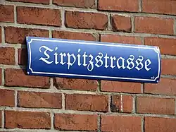 - In vielen Städten (Hamm, Oberhausen, Oldenburg, Plön u. a. m.) gibt es eine Tirpitzstraße.