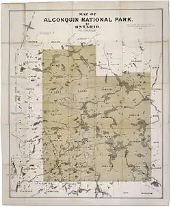 Erst am Ende des 19. Jh. wurden die ersten Naturschutzmaßnahmen durch die damalige kanadische Regierung ins Leben gerufen und der Algonquin Provincial Park wurde 1893 gegründet.[4] Die Regierung setzte eine Migration der Siedler aus dem Park durch und kontrollierte zudem die Pelztierjagd im Park. Auch in der Holzindustrie kam es durch die Interventionen der kanadischen Regierung und den kanadischen Großindustriellen J. R. Booth zu einem jähen Wechsel: Die Weymouth-Kiefern (Pinus Strobus) unterlagen nun einem Schutz und es wurden andere im Park vorhandene Holzarten für die Industrie interessant. J. R. Booth beschäftigte während der besten Zeiten seiner Firma über sechstausend Arbeiter und betrieb ein Eisenbahnnetz im Park. William Bell zeichnete bis 1908 eine erste Karte für Kanufahrer, das Verkehrsmittel, das in weiten Teilen als einziges die Fortbewegung ermöglichte. Dabei sind erstmals die Portagen erfasst worden.