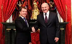 Aljaksandr Lukaschenka ist unter russischen Nationalisten so populär, dass Dmitri Rogosin ihn zu einem der Präsidentschaftskandidaten bei den russischen Wahlen 2008 ernennen wollte, wofür jedoch eine russische Staatsangehörigkeit erforderlich wäre, die er nicht besitzt. Aus dieser Initiative entstand die Bewegung Lukaschenko 2008.[122] Das generell positive Urteil über Lukaschenka ergibt sich unter anderem dadurch, dass sein autoritärer Kurs Verwerfungen wie im Russland der 1990er Jahre vermieden habe, „sowohl das Aufkommen einer Oligarchenschicht als auch die Einwanderung zentralasiatischer Gastarbeiter“ fanden nicht statt.[123]
