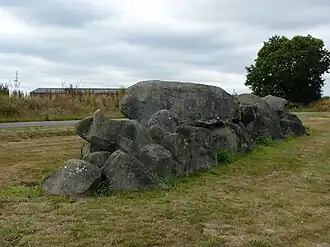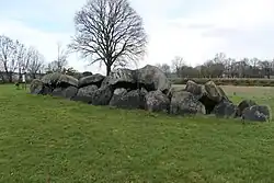 Das Südost-Nordwest orientierte Galeriegrab aus Dolerit ist eines der ersten Denkmäler, die durch den französischen Staat geschützt wurden. Die etwa 16,0 m lange Megalithanlage besteht aus 28 Tragsteinen (14 in situ) und acht Deckenplatten. Sie wurde 1854 von Jules Henri Geslin de Bourgogne (1812–1877) ausgegraben. Gefunden wurden eine Urne mit Knochen, Äxte, Perlen, Werkzeuge aus Feuerstein und verschiedene Bronzen. Gallo-römische Überreste zeigen, dass das Denkmal wiederverwendet wurde.