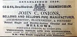 1866 erhielt das Unternehmen ein Patent für einen tragbaren Blasebalg. 1875 wurde die John C. Onions Company eingerichtet, von der angenommen wird, dass sie aus John Collingwood Onions’ früherem Betrieb hervorging. Der Sitz des Unternehmens war 1877 an 20 Colmore Row.
