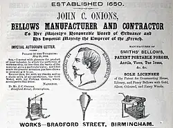 Die Onions-Familie betrieb seit 1650 in Birmingham die handwerkliche Herstellung von Blasebälgen. 1820 ist ein Simon Onions, Blasebalgmacher, an der Bradford Street nachweisbar. John Collingwood Onions, 63 und 64 Bradford Street, Smithfield (Birmingham), betrieb die Herstellung um 1845 als Manufaktur. Im gleichen Jahr ist auch ein James Onions an 32 Worcester Street in Birmingham nachzuweisen. John Collingwood Onions’ Wohn- und Geschäftshaus brannte 1853 nieder. Die Familie, die im Haus lebte, konnte sich retten. Anlagen und Lager wurden vollständig zerstört; letzteres wurde als größtes seiner Art im Land genannt. Onions beschäftigte zu dieser Zeit 100 Angestellte. Im folgenden Jahr erhielt das Unternehmen eine Goldmedaille von Napoleon III., was in einer Anzeige für die Weltausstellung von 1862 in London herausgestellt wurde.
