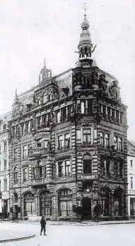 Das Geschäftshaus Alleestraße 24 in Düsseldorf wurde von 1882 bis 1883 von den Architekten Otto van Els & Bruno Schmitz im Stil des Historismus in Anlehnung an Formen der deutschen Renaissance (Nordische Renaissance) errichtet. Es zeigte über dem Erdgeschoss ein Galeriestockwerk. Darüber befanden sich die Wohngeschosse. Im Jahre 1904 wurde die Außenerscheinung des Hauses mit Eckturm und „malerischen“ Erkerausbauten beschrieben, die das Straßenbild in „wirkungsvoller Weise“ belebten.[1] Das prominente Eckgebäude erwähnte Rudi vom Endt wegen der „bizarren Ecktürmchen und alten Fassaden“.[2] Ebenso erschien das Gebäude als Postkartenmotiv.