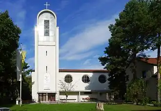 Die von Felix Hinssen entworfene Kirche nimmt die Berliner Tradition der frühen 1930er Jahre nochmals auf. Es entsteht als Anbau an das ältere Pfarrhaus eine Saalkirche als verputzter Mauerwerksbau. Der seitlich stehende Glockenturm besteht aus zwei seitlichen Wänden in Stahlbeton, dazwischen, etwas eingezogen, die Glockenstube, die mit einem Tonnengewölbe überdeckt ist. Die Stirnflächen der Glockenstube wurden Mitte der 1990er Jahre verglast. Das Kirchenschiff ist mit einem abgewalmten Satteldach bedeckt. Die Fassade zur Straße hat ein rechteckiges Portal und wird von der darüber liegenden großen Fensterrose, hinter der die Empore für die Orgel liegt, dominiert. Die Seitenwände haben hochliegende Rundfenster.