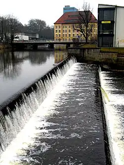 Großes Überfallwehr, Blick vom Stauwärterhaus des Walzenwerks Richtung Ratsmühle