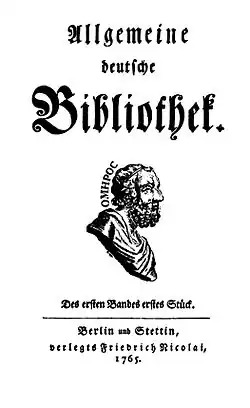 - Man leget hier dem deutschen Publico das erste Stück, der allgemeinen deutschen Bibliothek vor, wovon vierteljährig ein Stück von ohngefähr eben der Stärke erscheinen wird. Zwey Stücke werden einen Band ausmachen und jeder Band wird mit dem Bildnisse eines berühmten deutschen Schriftstellers gezieret seyn.