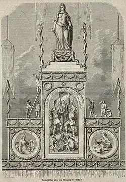 An der östlichen Seite des Platzes wurde eine imposante Festhalle erbaut, die Entwürfe stammten vom Leipziger Architekten und Mitglied des Bauausschusses Constantin Lipsius. Der reichhaltig ausgeschmückte und größtenteils hölzerne Bau war 226 Meter lang und 34 Meter breit. Der Mittelteil war etwa 19 Meter hoch, die beiden flacheren Seitenteile etwa 11 Meter. Vorder- und Rückfront waren mit großflächigen Fensterreihen ausgestattet, wobei die unteren mit Stoffen dekoriert und die oberen mit Glasmalereien ausgestattet waren. Die Hauptfront in Richtung Turnplatz war durch vier Türme mit pyramidendachförmigen Fahnenaufbauten gekennzeichnet. Die beiden äußeren knapp 30 Meter hohen Ecktürme (mit Fahnenaufbau 45 Meter) wurden mit einem Treppenhaus und einer Aussichtsplattform auf halber Höhe ausgestattet. Die beiden mittig gelegenen etwa 31 Meter (mit Fahnenaufbau 47 Meter) hohen Türme umrahmten das Portal der Festhalle. Eine Uhr im linken Turm zeigte die Stunden an, eine im rechten die Minuten.[10][11][13] Über dem hohen Haupteingang waren drei allegorische Tafelgemälde von Heinrich Leutemann angebracht, den oberen Abschluss des Portals bildete eine Germania darstellende und acht Ellen hohe[14] (etwa 4,50 Meter) hohe Kolossalstatue, geschaffen vom Leipziger Bildhauer Ludwig Albrecht.[15]