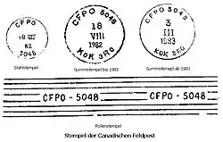 Austauschpunkt 1960: Düsseldorf und Zweibrücken. Am 16. Januar 1962 werden das Postamt Baden-Baden 1 als weiteres Austauschamt für Sendungen an die kanadischen Streitkräfte (CAPO 5056 auch zusätzlich RCAF) genannt. Vom 1. Juni 1963 an CAPO 5050 Werl (Westf.), CAPO 5056 Baden-Baden 1, Sendungen mit sonstigen CAPO-Anschriften sowie Anschriften von Luftwaffeneinheiten (RCAF = Royal Canadian Air Force) nach Zweibrücken 1 [279/63]. Am 1. Mai 1965 ändert sich die Bezeichnung der kanadischen Militärpostämter ist von C.A.P.O. (Canadian Army Post Office) in C.F.P.O. (Canadian Forces Post Office). Am 5. Mai 1967 werden C.F.P.O. 5.000 Lahr (Schwarzwald), C.F.P.O. 5050 Werl, Westf., C.F.P.O. 5055 Zweibrücken 1, C.F.P.O. 5056 Baden-Baden genannt. am 1. Juli 1969 C.F.P.O. 5055 wird von Zweibrücken zum Militärflugplatz Ramstein verlegt. Es bestehen zusätzlich C.F.P.O 5000 Lahr (Schwarzwald), C.F.P.O 5050 Werl (Westf.), C.F.P.O 5055 Landstuhl 4, C.F.P.O 5056 Baden-Baden 1. Nach Mitteilung der kanadischen Postverwaltung vom 3. September 1974 ist wegen der in Kanada bestehenden Zweisprachigkeit die Abkürzungsbezeichnung der in der BRD eingerichteten kanadischen Militärpostämter CFPO (Canadian Forces Post Office) gleichbedeutend mit BPFC (Bureau de Postes des Forces canadiennes). Seit dem 8. Oktober 1981findet der Postaustausch nun auch in 5130 Geilenkirchen - CFPO 5053 Geilenkirchen statt. Stand 1986: 5130 Geilenkirchen (CFPO 5053), 6792 Ramstein-Miesenbach 3 (CFPO 5055), 7570 Baden-Baden (CFPO 5056), 7630 Lahr (CFPO 5000).