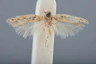 Die Falter haben eine Flügelspannweite von 11 bis 12 Millimeter. Der Kopf glänzt gelblich weiß. Die Fühler sind dunkelbraun und grauweiß geringelt. Thorax und Tegulae sind fahl ockerfarben. Die Vorderflügel sind ockerfarben weiß und haben an der Flügelbasis einen ockerbraunen Fleck an der Costalader. Eine bogenförmige ockerbraune Binde verläuft bei 1/5 der Vorderflügellänge von der Costalader zur Analfalte. Der basale Teil der Vorderflügel ist fahl ockerfarben braun gefärbt und wird in Richtung der Binde dunkler. Ein ockerfarbener brauner Fleck befindet sich bei 2/5 der Vorderflügellänge an der Costalader, in der Flügelmitte ist er mit einem ockerfarbenen Längsstrich verbunden. Der Apikalbereich ist mit ockerfarbenen und ockerfarben braunen Schuppen bedeckt. Die dorsale Vorderflügelhälfte ist ab dem Längsstrich bis zum Apex grau getönt. Die Fransenschuppen sind gelblich weiß. Die Hinterflügel glänzen gelblich weiß.