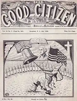 Unter ihrer Führung entwickelte die Pillar of Fire Church eine enge und öffentliche Partnerschaft mit dem Ku-Klux-Klan.[6] White unterstützte den Ku-Klux-Klan in jeder Weise. Sie erlaubte Klan-Treffen und Kreuzverbrennungen auf verschiedenen Grundstücken der Pillar of Fire Church und nahm gelegentlich sogar daran teil. In der monatlichen Zeitschrift The Good Citizen[7] propagierte sie die Ideologie des Ku-Klux-Klans. Und auch noch nachdem ihre Verbindung zum Ku-Klux-Klan ab den 1930er Jahren lockerer wurde, veröffentlichte sie in den 1940er Jahren überarbeitete Ausgaben ihrer Bücher über den Klan in einer dreibändigen Ausgabe unter dem Namen Guardians of Liberty.