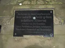 Dem Begründer des Almetal-Central-Wasserwerks / Herrn Landrat Dr. von Savigny zu Büren / In dankbarer Erinnerung / errichtet von den Gemeinden / Ahden, Barkhausen, Brenken, Steinhausen, / Wewelsburg, Oberntudorf und Niederntudorf