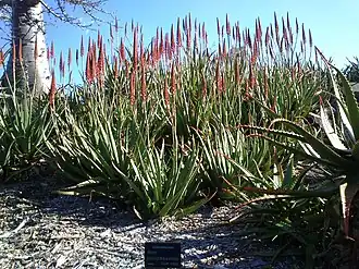 Der Blütenstand besteht aus zahlreichen Zweigen und erreicht eine Länge von 100 bis 150 Zentimeter. Die unteren Zweige sind nochmals verzweigt. Die kopfigen Trauben sind 3 bis 6 Zentimeter lang, 7 Zentimeter breit und bestehen aus etwa 15 Blüten. Die deltoid spitz zulaufenden Brakteen weisen eine Länge von 8 Millimeter auf. Die an der Basis trüb scharlachroten Blüten sind an ihrer Mündung heller. Sie stehen an 20 Millimeter lange Blütenstielen. Die Blütenstiele an den seitlichen Trauben sind kürzer. Die Blüten sind 27 Millimeter lang und an ihrer Basis gerundet. Auf Höhe des Fruchtknotens weisen die Blüten einen Durchmesser von 5,5 Millimeter auf. Darüber sind sie auf 3,5 Millimeter verengt und schließlich zur Mündung auf 6 Millimeter erweitert. Ihre äußeren Perigonblätter sind auf einer Länge von 7 Millimetern nicht miteinander verwachsen. Die Staubblätter und der Griffel ragen kaum aus der Blüte heraus.