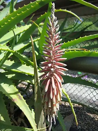 Der Blütenstand ist in der Regel einfach oder besteht gelegentlich aus ein bis zwei Zweigen. Er erreicht eine Länge von 50 bis 100 Zentimeter. Die dichten, konischen Trauben sind 12 bis 30 Zentimeter lang und 5 bis 6 Zentimeter breit. Die deltoid-spitzen Brakteen weisen eine Länge von 8 Millimeter auf und sind 3 bis 4 Millimeter breit. Die meist kurz flaumhaarigen, scharlachroten, grünlich gelb gespitzten Blüten sind nur selten einheitlich grünlich gelb. Sie stehen an 4 bis 6 Millimeter langen Blütenstielen. Die Blüten sind 28 bis 31 Millimeter lang und an ihrer Basis kurz verschmälert. Auf Höhe des Fruchtknotens weisen die Blüten einen Durchmesser von 6 bis 7 Millimeter auf. Darüber sind sie nicht verengt. Ihre Perigonblätter sind auf einer Länge von 19 bis 21 Millimeter nicht miteinander verwachsen. Die Staubblätter und der Griffel ragen 3 bis 4 Millimeter aus der Blüte heraus.