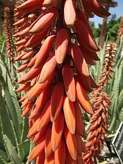 Der aufrechte Blütenstand besteht aus bis zu sechs Zweigen und erreicht eine Länge von bis zu 110 Zentimeter. Die sehr dichten, zylindrischen Trauben sind 45 Zentimeter lang und 4 Zentimeter breit. Die papierartigen, fünfaderigen, eiförmig-lanzettlichen Brakteen weisen eine Länge von 12 bis 15 Millimeter auf. Die leuchtend roten, keulenförmigen Blüten stehen an 2 bis 5 Millimeter langen Blütenstielen. Die Blüten sind 30 bis 35 Millimeter lang und an ihrer Basis gerundet. In ihrer Mitte weisen sie einen Durchmesser von 11 Millimeter auf. Ihre äußeren Perigonblätter sind auf einer Länge von etwa 21 bis 22 Millimeter nicht miteinander verwachsen. Die purpurbraunen Staubblätter ragen 10 bis 15 Millimeter, der Griffel 12 Millimeter aus der Blüte heraus.