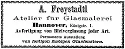 Freystadtl, der zeitweilig als A. Freystadtl, Erste Hannoversche Glasmalerei auftrat,[3] stellte von seinem Sitz in der Königstraße 53 aus[4] seine „Neuerungen in dem Verfahren zur Herstellung von Kathedralglas“ vor. Dies betraf farbig überfangene oder durch die gesamte Masse gefärbte geblasene oder gegossene Glastafeln, die mit einer speziell zubereiteten Mixtur überstrichen wurden.[5] Hierfür erhielt er mit einer Patentschrift den entsprechenden Schutz durch das Kaiserliche Patentamt.[6]