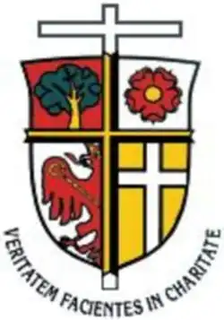 Unten im Halbrund der Wahlspruch VERITATEM FACIENTES IN CHARITATE – Die Wahrheit in Liebe tun.