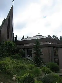 Nachdem ein Vorgängerbau von 1957[42] unrettbar baufällig geworden war, wurde in den 1980er Jahren ein Neubau beschlossen. Das von dem Architekten Winfried Landsberg entworfene Konzept zweier in sich verschobener Sechsecke zitiert in seiner zeltartigen Erscheinung weitere Godesberger Kirchen. Durch die Hanglage konnten für das Nutzungskonzept als Kirche einer Schule vorteilhafte Eigenschaften verwirklicht werden. Die Kirche besteht aus einer Oberkirche und einer – zumeist als Krypta bezeichneten – Unterkirche. So finden Gruppen, wie etwa eine Jahrgangsstufe, einen angemessenen Raum in der Krypta, aber auch große Gruppen können in der Oberkirche gemeinsam Gottesdienst feiern. Weiterhin ermöglicht die Unterteilung auch bis zu einem gewissen Grad das Abhalten weltlicher Veranstaltungen, da das Allerheiligste und der feste Altar räumlich von der Oberkirche getrennt sind.[43]