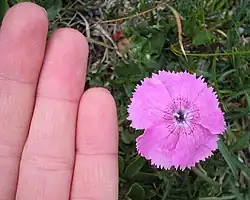 Die Blütezeit reicht von Juni bis August. Die Blüten stehen einzeln am Sprossende, seltener zu zweit oder dritt.[1] Die duftlosen, zwittrigen Blüten sind bei einem Durchmesser von 2 bis 3 Zentimetern radiärsymmetrisch und fünfzählig. Der röhrig-glockige Kelch ist 12 bis 18 Millimeter lang. Zwei oder vier krautige Kelchschuppen sind in einer langen Spitze ausgezogen. Die Platte der Kronblätter ist 10 bis 15 Millimeter lang und horizontal abstehend.[1] Die vorn am Rand gezähnten Kronblätter sind fleischfarben. Der Schlund ist tief purpurfarben und weiß gesprenkelt. Jede Blüte hat 10 Staubblätter und 2 Griffel. Die Kapselfrucht ist kürzer als der Kelch.[1]