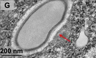 Virion von „Orpheovirus“ mit Faserschicht, Schema