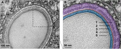 Die TEM-Aufnahmen (rechts koloriert) zeigen die Ultrastruktur von Alphaorpheovirus massiliense: reife Partikel besitzen eine kleine Fibrillenschicht (1, violett), eine äußere Schicht (2, rot), eine Kapsidschicht (3, blau) und eine innere Membran (4, weiß) aufweisen, die den Kern des Partikels (5, grau) einschließen.