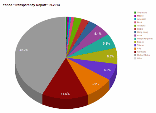 Im Sommer 2013 wurde durch den Whistleblower Edward Snowden bekannt, dass die National Security Agency (NSA) an E-Mail-Provider herangetreten war, um im großen Stil Kommunikationsdaten der Kunden anzufordern. Yahoo hat, wie andere Anbieter, im Nachlauf der Debatte über diesen Datenschutzskandal Transparenzberichte veröffentlicht. In der nebenstehenden Grafik ist diese Statistik zu sehen: Die US-Behörden holten im ersten Halbjahr 2013 die meisten Daten von Yahoo-Kunden in den USA ein (12.444 Anfragen), gefolgt von Deutschland (4.295) und von Italien, Taiwan, Frankreich und Großbritannien.