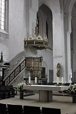 | Laienaltar | 1477 | ./. | Bernt Notke (Werkstattzuschreibung) | Dom | Viersitziges Chorgestühl aus der Zeit des Bischofs Heinrich II. Bochholt, dem im Zuge der Stiftungen Bischof Krummendieks vier Tafelbilder als Retabel des Laienaltars hinzugefügt wurden, von denen die beiden mittleren als bewegliche Flügel konstruiert waren. Die Tafeln zeigen den St. Clemens, Maria mit dem Jesuskind, Johannes den Täufer und St. Agnes mit Schriftbändern, die auf das Lamm Gottes hinweisen; auf der anderen Seite die beiden Dompatrone St. Blasius und St. Nikolaus. Die Maße der Flügel sind 132 × 52 cm, des gesamten Rahmens 169,8 × 273,2 cm.[10] Bis 1942 stand der Laienaltar in der mittleren Lettner-Öffnung; seit der Restaurierung 1996 westlich der den Chor abschließenden Glaswand. | |