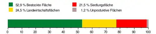 Es besteht zu 52,9 % aus bestockter Fläche, zu 24,5 % aus Landwirtschaftsfläche, zu 21,5 % aus Siedlungsfläche und zu 1,2 % aus unproduktiven Flächen.