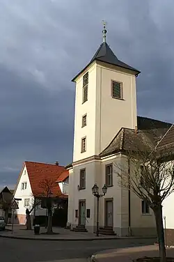 Die frühklassizistische Saalkirche wurde 1784–86 unter Markgraf Karl Friedrich gebaut. Sie besteht aus einem zweigeschossigen Langhaus, einem eingezogenen Chor im Osten und einem Kirchturm im Westen, der fast vollständig in das Langhaus eingestellt ist. Die oberen Geschosse des Kirchturms beherbergen die Turmuhr und den Glockenstuhl mit drei Kirchenglocken. Darauf sitzt ein achtseitiger, schiefergedeckter Knickhelm.