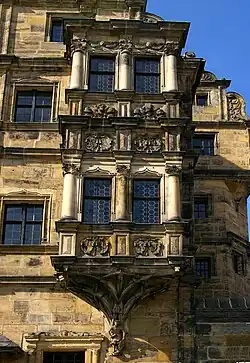 Unter der Regierung von Fürstbischof Veit II. von Würtzburg (1561–1577) wurden Teile des Palas aus der Zeit von Kaiser Heinrich II. abgebrochen oder in den Renaissancetrakt integriert. Das Gebäude wurde ab 1570 unter Leitung von Erasmus Braun, der sich unterhalb des Erkers selbst verewigt hat, in der heutigen Form errichtet. An dem Erker sind unterhalb der Fenster Wappen von Adelsgeschlechtern eingemeißelt. Die Fassade des Renaissancegebäudes war ursprünglich farbig gefasst.