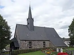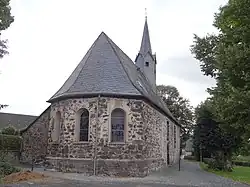 Die 22–23° überzwerch geostete, einschiffige Saalkirche ist am westlichen Ortsrand am Rande eines Friedhofs aus Bruchsteinmauerwerk errichtet. Sie hat einen dreiseitigen flachen Chorabschluss, der mit dem gesamten Ostteil zum ältesten erhaltenen Gebäudeteil gehört. Der Ostteil ist 8,03 Meter lang, der Westteil 13,12 Meter, die Langseite ohne den Chorabschluss 19,80 Meter. Die Breite ohne den Sakristeianbau beträgt 7,72 Meter.[14] Auf dem verschieferten Satteldach geht der vollständig verschieferte Dachreiter von einem Sechseck mit sechs Giebeln in einen Spitzhelm über, der von Turmknopf, Kreuz und Wetterhahn bekrönt wird. An der östlichen Südseite ist eine Sakristei unter einem Schleppdach angebaut, die an der Südseite drei kleine quadratische Fenster hat.