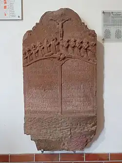 Zwei Grabsteine aus rotem Sandstein flankieren das Portal an der westlichen Giebelseite und stehen unter der zweiseitigen Außentreppe. Der linke Grabstein für Pfarrer Johann Georg Weiß (Albinus) datiert von 1708 und ist 1,47 Meter hoch und 0,73 Meter breit. Zwei Engel, die die Lebenskrone halten, sind über der ovalen Fläche mit Inschrift angebracht, die von Akanthusranken flankiert wird. Die rechte Grabplatte für den 1768 verstorbenen Konrad Schmand ist 1,35 Meter hoch und 0,82 Meter breit. Die Vorderseite trägt im oberen Drittel in der Mitte Kreuz und Korpus, dem links vier männliche und rechts fünf weibliche Figuren mit gefalteten Händen zugewandt sind, offensichtlich die Nachkommen. Die Rückseite trägt in der Mitte, unter dem Pinienzapfen und dem 0,26 Meter hohen Schwung, die Lebenskrone. Links und rechts davon sind, etwas unterhalb, zwei Engel gemeißelt. Im Chorraum der Kirche steht ein Grabstein für Ottmar und Loisa Dentzer, die beide im Jahr 1676 starben. Er ist 1,34 Meter hoch und 0,68 Meter breit. Über der zweispaltigen Inschrift ist Christus am Kreuz dargestellt. Ihm betend zugewandt und nach Größe gestaffelt sind links sechs männliche und rechts fünf weibliche Personen zu sehen. Offenbar werden der Vater mit den Söhnen und die Mutter mit den Töchtern dargestellt.[17]