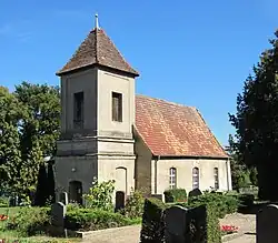 Den Zugang zur Kirche bildet ein segmentbogig geschlossenes Portal mit zweiflügliger Tür auf der Westseite des schlichten Kirchturms, der im Erdgeschoss auf der Nord- und Südseite jeweils eine ebenfalls segmentbogig abgeschlossene Blende aufweist. Das sich über zwei einfachen Gesimsen erhebende Turmobergeschoss besteht zum Teil aus mit Ziegelmauerwerk verblendetem Fachwerk. Die Gliederung der mit rechteckigen Schallöffnungen an drei Seiten versehenen Fassaden erfolgt durch eine glatte Lisenenrahmung an den Ecken. Der Turm schließt mit einem Pyramidendach ab, das Satteldach des Kirchenschiffs ist im Osten polygonal abgewalmt. Die Dächer sind mit Biberschwanzziegeln gedeckt.