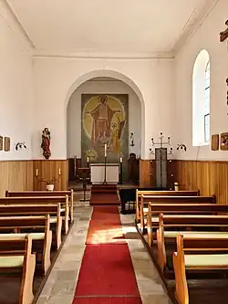 Das ursprüngliche Altargemälde Martyrium des heiligen Veit im Ölkessel von Eduard Schwoiser hängt heute über dem Eingang. Im Altarraum findet man seit 1968 das Monumentalfresko Christus erscheint zum Weltgericht von Karl Manninger.[3]