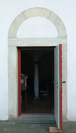 Die Kirche wird durch das tief gelegene Westportal und durch das 1985 geschaffene, ebenerdige Nordportal erschlossen. Das Gewände ist im romanisierenden Stil aus hellem Stein und geradem Sturz, über dem ein Rundbogen angebracht ist, gestaltet. Vor dem Nordportal ist ein rundbogiger grauer Grabstein des 18. Jahrhunderts aufgestellt,[1] der an den Schultheiß Johann Caspar Schäf(f)er (1659–1750) erinnert, der mit 90 Jahren verstarb.[7] Unterschiedlich große Rechteckfenster mit rot bemalten Holzgewänden belichten die Kirche, im Norden zwei, im Osten eins und im Süden drei Fenster.
