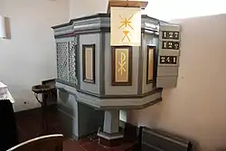 Die polygonale Kanzel datiert von 1706. Der Kanzelkorb auf einem sechsseitigen Fuß hat hochrechteckige kassettierte Füllungen an den Kanzelfeldern, auf dem vorderen Feld ist in goldenen Buchstaben das Christusmonogramm angebracht. Der Kanzelaufgang in der Südostecke ist hinter vergittertem Rautenwerk verborgen und führt den oberen profilierten Gesimskranz des Kanzelkorbs fort.