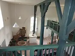 In der Raummitte und hinter dem Altar wurden massive neue Deckensäulen aus Eichenholz aufgestellt, die Saaldecke erneuert und eine neue barocke Kanzel mit Pfarrstand errichtet. Die West-Empore stockte man mit einer Hochempore auf. Alle Brüstungen der Emporen wurden erneuert, die Fachwerke mit Vierkantstäben ausgefüllt und oben auf den Brüstungsbalken Platznummern eingeschnitzt (heute noch sichtbar). Auch die Sitzbänke der Frauen unterhalb der Emporen erhielten Platznummern; sie hatten, wie alle Bänke in der Kirche, keine Rückenlehnen (vermutlich wollte man dem Kirchenschlaf damit begegnen).