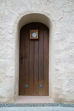 Romanische Pforte am östlichen Ende der Südwand mit Jakobsmuschel an der Türe, heute Hauptzugang