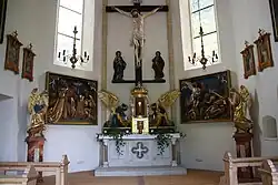 Die polychromen Holzreliefs an den Chorschrägen schuf Josef Bachlechner der Ältere 1913, links Opfer Abrahams und rechts Opfer Melchisedechs. Über dem Portal zeigt das ehemalige Altarblatt die Heiligen Christophorus und Jakobus gemalt von Rupert Meier 1739. Die Orgel aus 1837 stammt von Joseph Aigner.[1]