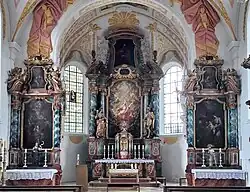 Der Hochaltar mit der Hl. Margaret von 1712 stammt von Franz Fröhlich, die seitlichen Holzfiguren zeigen die Heiligen Johannes und Georg.