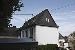Das erste bis 1839 genutzte Schulhaus befand sich an der Ecke Schulgraben/Hauptstraße. Dieses Eckhaus Hauptstraße Nr. 48 war 1928 in Besitz des Gastwirts Stephan Mechtel. Beim Abriss des Hauses aus verkehrsbedingten Gründen im Jahre 1928 überließ Stephan Mechtel Teile des schönen und reich verzierten Fachwerks Herrn Pastor Koster.[1] Diese Teile zieren heute wieder den Hausflur des Erdgeschosses im Lösnicher Pfarrhauses. Das auf Kopfbändern ausladende Fachwerkobergeschoss hatte vier Fensterpaare und eine Gruppe von drei Fenstern in wenig vortretenden Rahmen mit Zahnschnittgesimsen und Kerbschnitzereien (Flechtwerk und Scheibenfriesen).[2] Beim Abbruch kam laut Pastor Koster auch ein Türsturz mit der Jahreszahl 1432 zum Vorschein, der mit gotischen Minuskeln versehen war.[1] Stephan Mechtel soll beabsichtigt haben, dieses alte geschichtliche Dokument in der Unterbau der an jener Stelle geplanten Veranda einmauern zu lassen.[3] Der Stein ist mittlerweile jedoch verschollen.