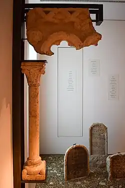 Fragmente der Bima wurden schon um 1940 gefunden.[10] Zwei Stücke der Brüstung, ein Säulchen mit Knospenkapitell und das Fragment eines Rundbogens befinden sich heute im Museum der Stadt Regensburg.[11]