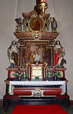 Der barocke Hochaltar wurde aus der alten Kirche entnommen. Laut der Inschrift wurde er 1705 errichtet. Die Initialen der Stifterin Anna Dorothea von Westphalen ADWgW sind am unteren Rand angebracht.