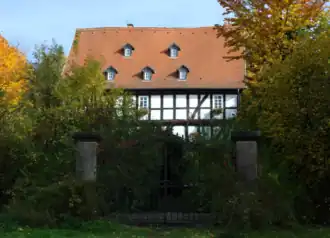 ![]() Heutiges Fachwerkhaus mit Eingang über dem Wassergraben | ||