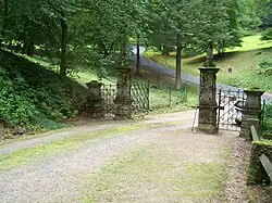 Die östliche Hauptzufahrt wurde im Talgrund vom „Obeliskentor“ markiert. Ein von vier Steinobelisken gehaltenes schmiedeeisernes Gittertor und anbindende Mauern und Zäune sperrten den Zugang, auch militärisches Wachpersonal sicherte einst den Schlossbereich. Der Zufahrtsweg zum Schloss wird von einer Baumallee beschattet, von der noch wenige Veteranen erhalten sind. Eine in ihrer Gestalt ungewöhnliche Linde wurde als „Hohler Baum“ schon vor 100 Jahren gerühmt. Über der Hauptzufahrt thront der Bonifatiusfelsen mit dem neu errichteten Kreuz.