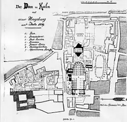 An der Nordseite des Domes stand die Kirche St. Maria in pasculo (St. Maria im Pesch). Die 1848 niedergelegte kleine Kirche war an der mittleren noch unfertigen Nordwand des Domes angebaut worden. Östlich, etwa an der Stelle, an der der um 1870 von Kaiserin Augusta den Kölnern gestiftete Petrusbrunnen errichtet worden war, stand die Kirche St. Maria ad Gradus, die 1817 abgebrochen wurde. Der Kirchenrückseite schloss sich der schon zu dieser Zeit nicht mehr genutzte Domkirchhof an. An der Südseite standen noch die St.-Johannis-Kirche, die Theologenschule (Theologische Fakultät der alten Universität) und das Priesterseminar sowie weitere alte Bauten, die im Rahmen der Freilegung des Domes später abgebrochen wurden. Die gewonnenen Freiflächen waren durch Bäume begrünt worden und erhielten teilweise bis zu zehn Meter breite kunstvoll gestaltete Rabatten.